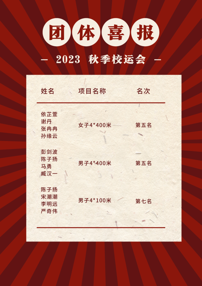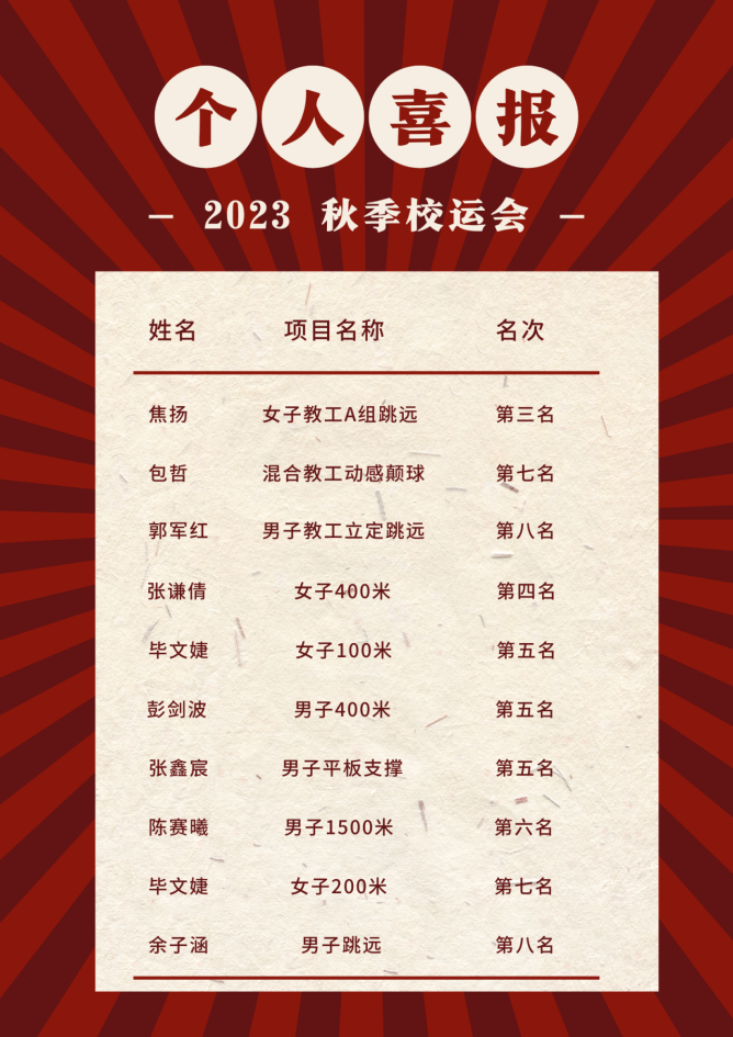 本次运动会我院运动健儿们在赛场上挥洒汗水,努力拼搏,取得了一项又一项佳绩,最终获得了“学生组总分第六”的嘉奖!